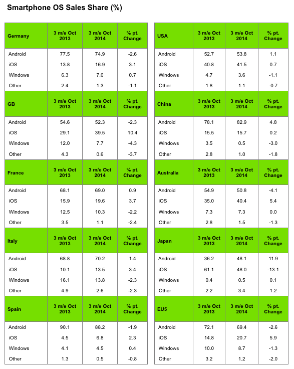 据 Phonearena 报道,十月份的移动通讯消费者指数显示,自 9 月 iPhone 6/ 6 Plus 发售三个月间,iOS 在欧洲市场份额同比上升 5.9%,为 20.7%;Android 下降 2.6%,为 69.4%,Windows Phone 下降 1.3%,为 8.7%。
