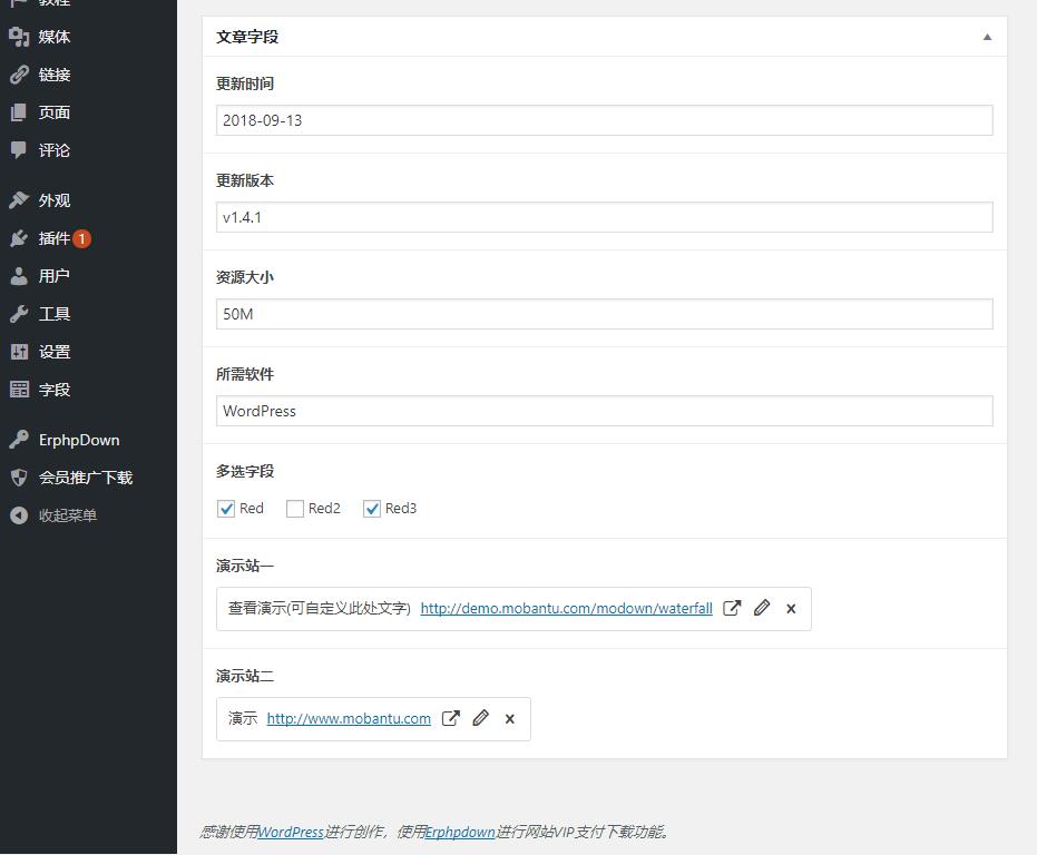 WordPress插件advanced custom fields自定义字段使用教程 83 由于我们的Modown主题集成了此插件,所以在此写个简单的教程供大家参考,Modown集成此插件的主要用途就是 http://demo.mobantu.com/modown/559 右侧栏购买处自定义文章属性的显示效果。 单个字段设置: 单个字段设置: 添加好字段组后,看后台发布文章处: 当然,此插件的功能比较强大,你可以根据分类的不同显示不同的字段组,请自行研究,这里模板兔就不说明了。 0